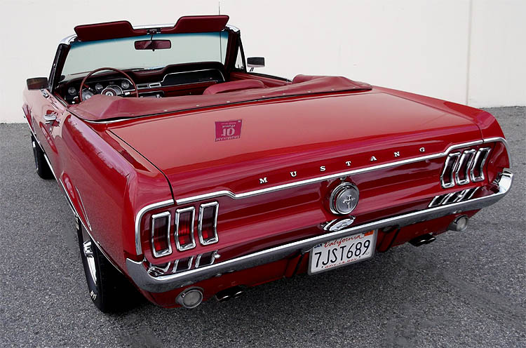 ![]() ![]() 1967 MUSTANG CONVERTIBLE, 289/225 HP, Cruise-O-Matic, 2.79:1 axle, Competition handling package, power top, power brakes, power steering, air conditioning, GT Equipment Group, quad exhaust tips, fog lights, turn signal hood, Sports console, Styled steel wheels, tinted glass, remote mirror, Exterior Decor Group, dual exterior mirrors, Visibility Group, Philco AM radio, 2 speed wipers w/ washers, day/night mirror, back up lights, Candyapple Red, Red interior, White top.