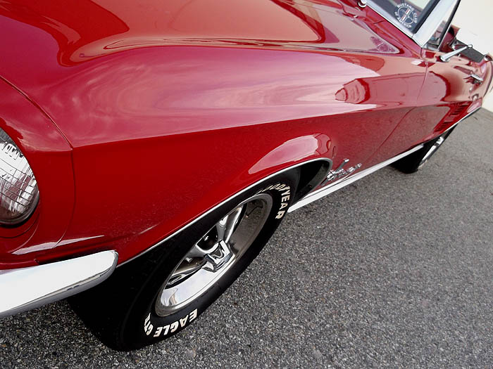 ![]() ![]() The fit and panel alignment on this particular Mustang is nothing less than arrow straight end to end that's show-cased in a Base/Clear paint finish (in it's original Code T Candy apple Red) that literally looks like a house of mirrors right through to the inside of the trunk lid. As well all of the requisite exterior jewellery you would expect to find on a top end show car are evident on this Mustang including; triple plated bumpers, professionaly polished stainless trim, new pinpoint grain white convertible top and pristine date coded exterior glass.