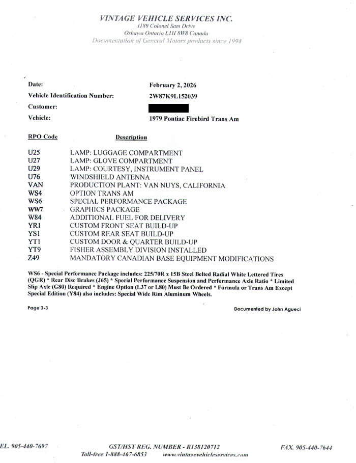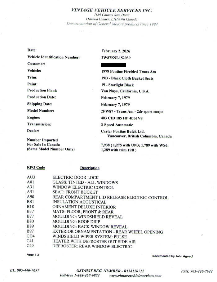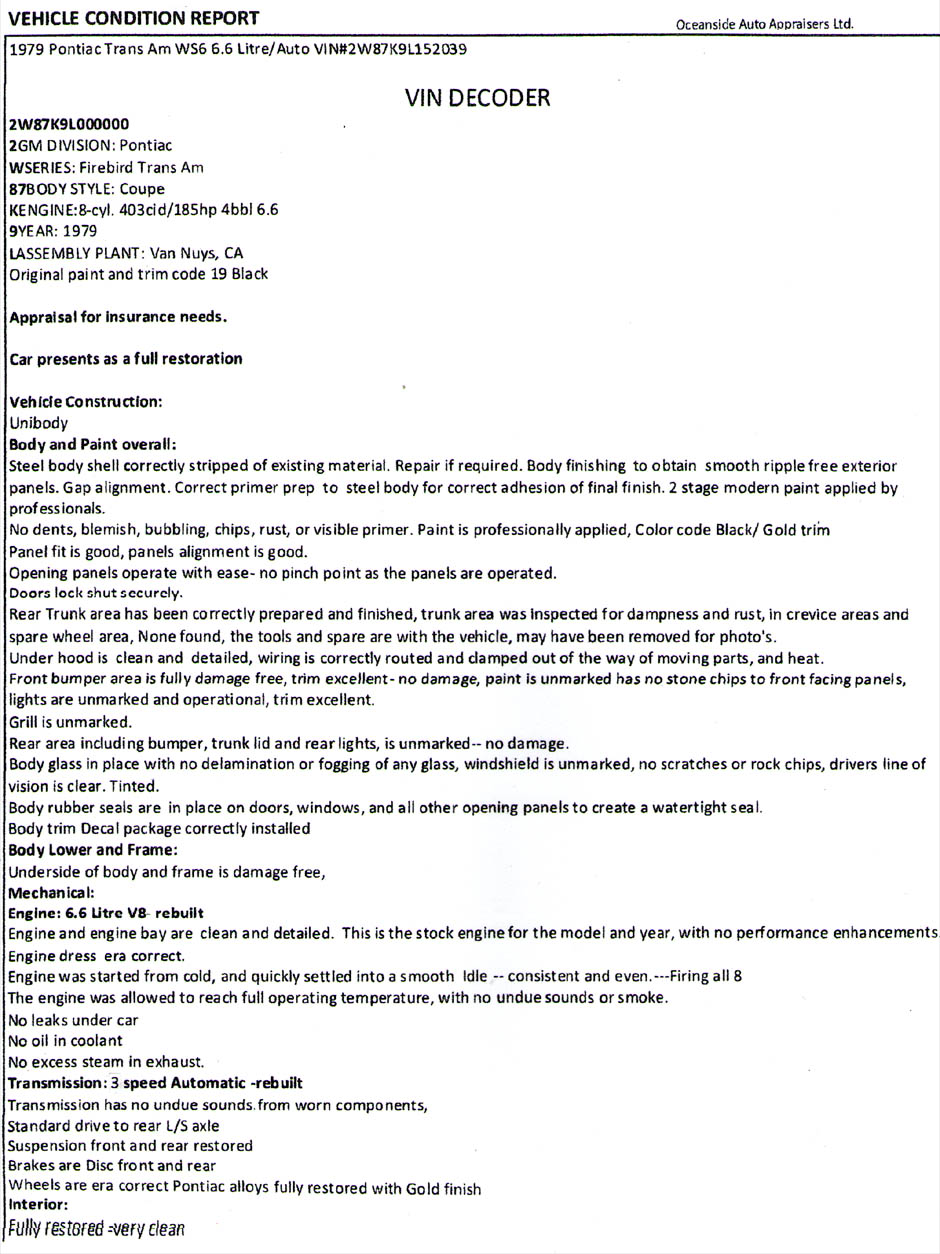 ![]() Pontiac was shorthand for performance throughout the 70's and nothing lived up yo the billing better than the WS6 Firebird Trans Am. A no expense spared restoration accurate to it's factory option codes right through to it's Starlight Black color, this T/A looks as good as it did the day it rolled off the Van Nuys California assembly line in 1979. This particular Trans Am checks all of the requisite boxes some of which include; complete numbers matching drivetrain, show quality fit and finish, 5 year Ceramic Coat, PHS documented, lifelong West Coast car, original sheet metal, desirable WS6 performance package, showroom new interior, immaculate undercarraige, collector owned, desirable factory Starlight black with Gold trim, showroom housed, part of a West Coast classic car collection, the list goes on. As well with only show miles driven since completion, this car runs and drives like new with everything mechanically sorted and in nothing less than perfect working order from the power windows right down to it's factory issue speed control.It was business as usual for the Trans Am that was one of the most upscale performance cars to come out of Pontiac Division's Firebird line up in 1979. This particular T/A leaves very little off the performance order form with factory options that include; WS6 option with rear disc brakes, specialized suspension, upgraded axle ratio, C80 limited slip , L80 engine, 15X7 cast aluminum wheels, guage package with factory tach, air induction hood, speed control, tilt steering and formula sport wheel to name a few (see window sticker) As well this is a multiple trophy winning, California built, lifelong West Coast car that retains it's factory issue sheet metal, Van Nuys cowl tag, receipts for restoration work completed and documentation to confirm it's factory issue options and original point of purchase dealership at Carter Pontaic in Vancouver B.C. Apply all of the above to any classic car and you have all of the value points for a genuine five star collectible for the serious buyer.