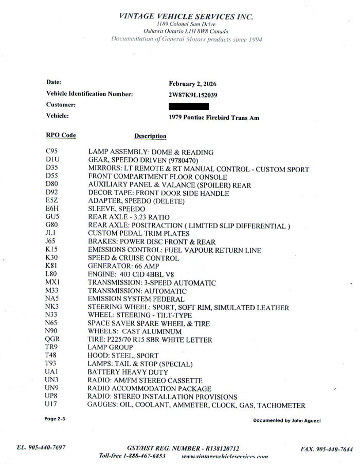 ![]() ![]() 1979 PONTIAC TRANS/AM , L80 403, TH350, WS6 performance package, 3:23 Posi, 4 wheel disc brakes, handling package, power steering, power disc brakes, shaker hood, gauge package, AM/FM, tilt steering, cruise control, power windows, power locks, power trunk, floor console, rear defog, tinted glass, light package, pedal trim package, Formula wheel, pulse wipers, 15X7 aluminum wheels, deluxe interior, splitter tips, Starlight Black, Black interior, Gold graphics.